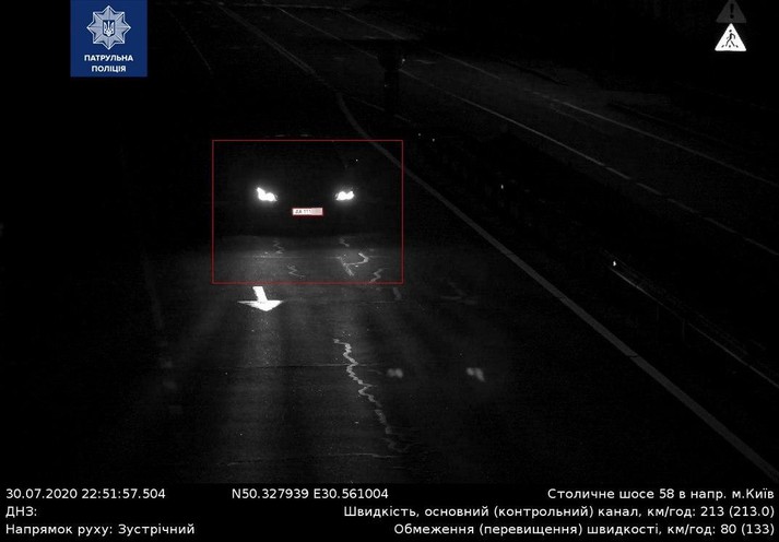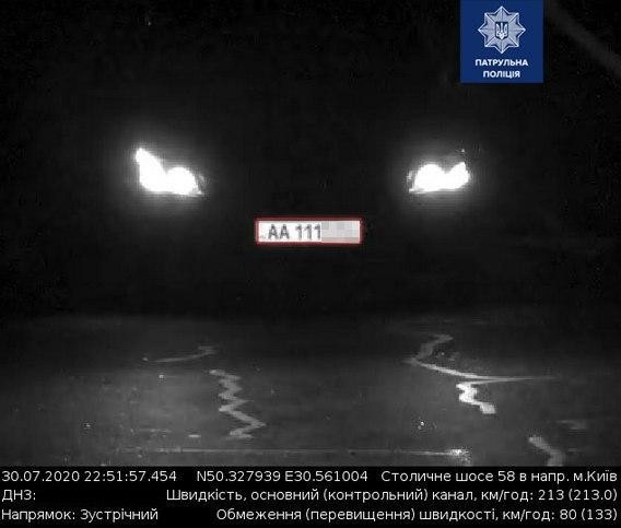 - Mercedes-Benz E 200 4Мatic (ДНЗ AA111***) - 213 км/год на Столичному шосе, де дозволена швидкість на вказаній ділянці 80 км/год.