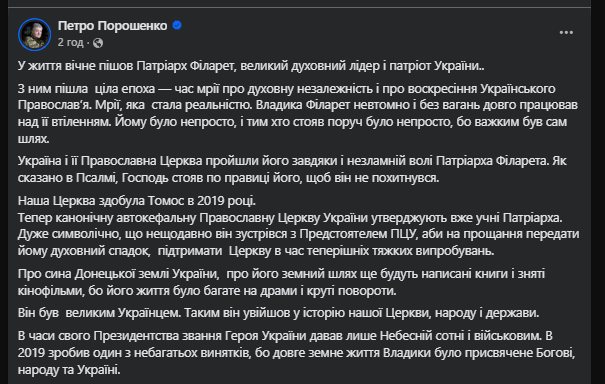 «У життя вічне пішов Патріарх Філарет, великий духовний лідер і патріот України. З ним пішла ціла епоха — час мрії про духовну незалежність і про воскресіння Українського Православ’я. Мрії, яка стала реальністю. Владика Філарет невтомно і без вагань довго працював над її втіленням. Йому було непросто, і тим хто стояв поруч було непросто, бо важким був сам шлях. Україна і її Православна Церква пройшли його завдяки і незламній волі Патріарха Філарета. Як сказано в Псалмі, Господь стояв по правиці його, щоб він не похитнувся», – написав Порошенко.