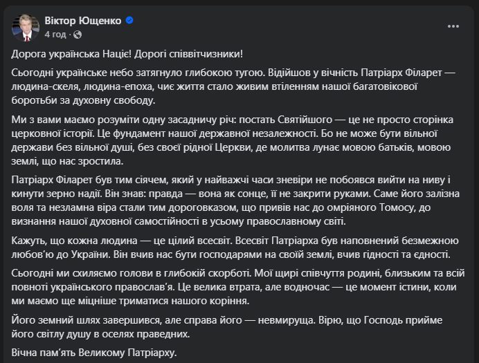 «Відійшов у вічність Патріарх Філарет – людина-скеля, людина-епоха, чиє життя стало живим втіленням нашої багатовікової боротьби за духовну свободу. Ми з вами маємо розуміти одну засадничу річ: постать Святійшого – це не просто сторінка церковної історії. Це фундамент нашої державної незалежності. Бо не може бути вільної держави без вільної душі, без своєї рідної Церкви, де молитва лунає мовою батьків, мовою землі, що нас зростила», – написав Ющенко.