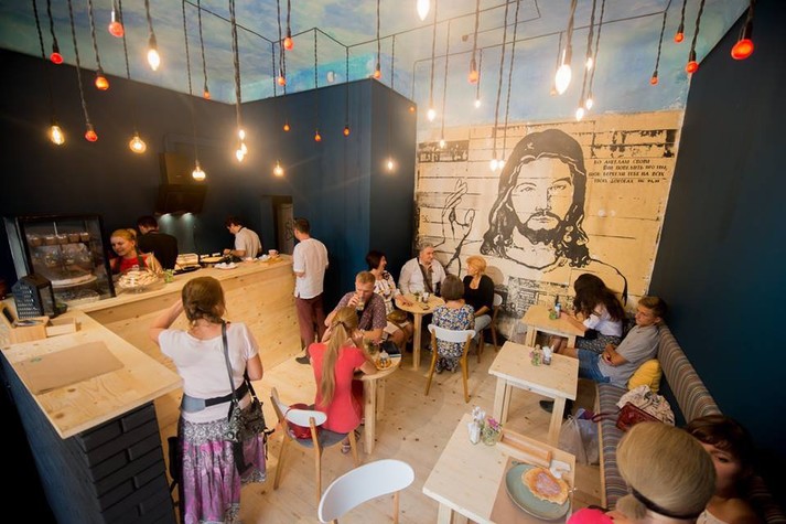 У закладі на всю стіну намальований портрет Ісуса, а у меню - немає цін. Відвідувачі залишають добровільні внески.