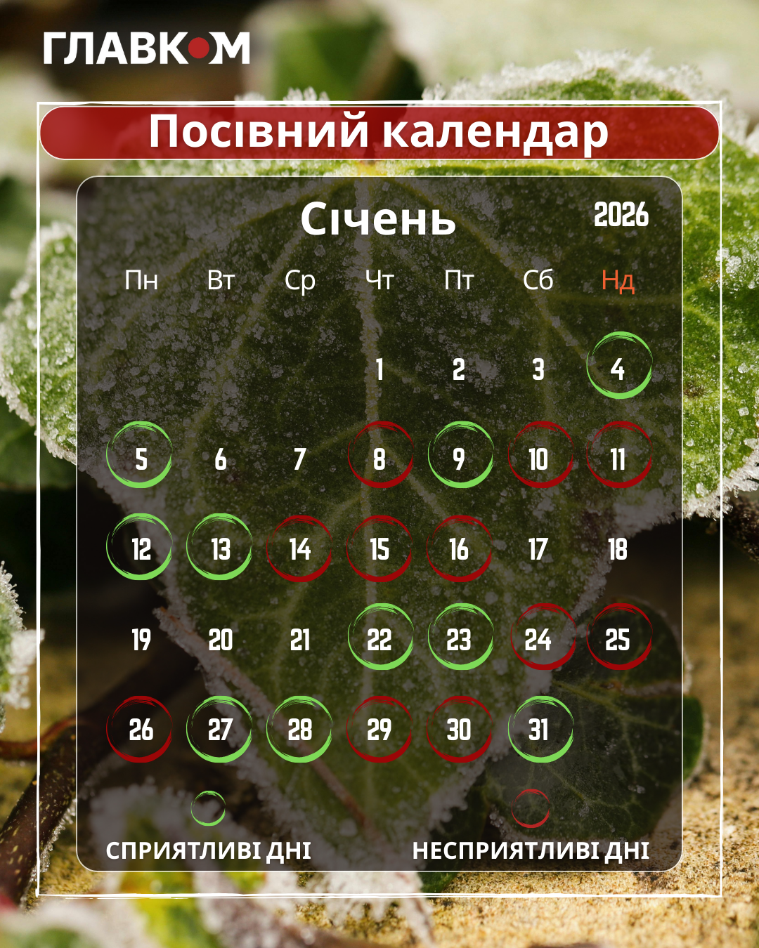 - 24–26 січня: Несприятливий період. Утримайтеся від активних робіт із ґрунтом. Займіться плануванням сівозміни на майбутній сезон.