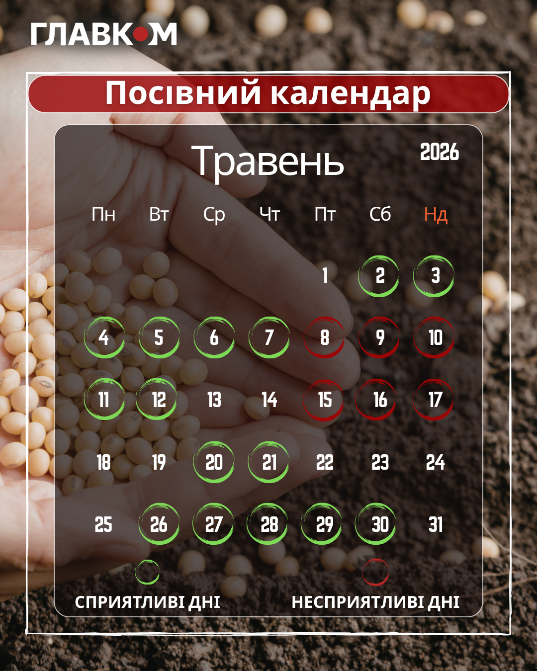 - Сприятливі дні для посіву та робіт: 2, 3, 4, 5, 6, 7, 11, 12, 20, 21, 26, 27, 28, 29, 30 травня.