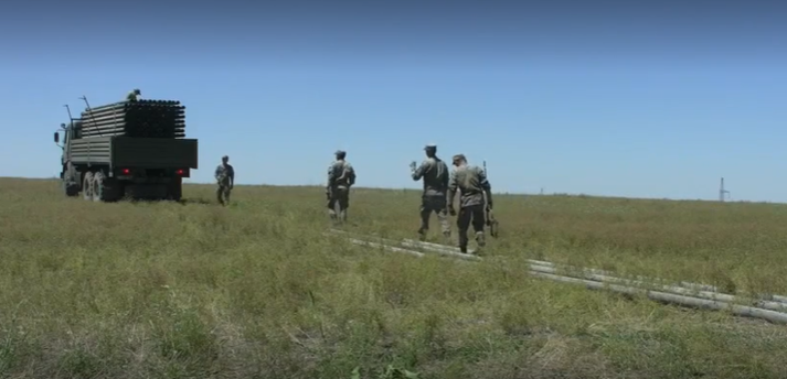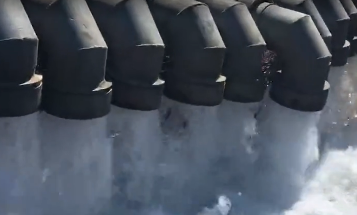 На кадрах видно, як чоловіки в формі займаються прокладкою труб і в кінці вода під великим напором б'є з труб.
