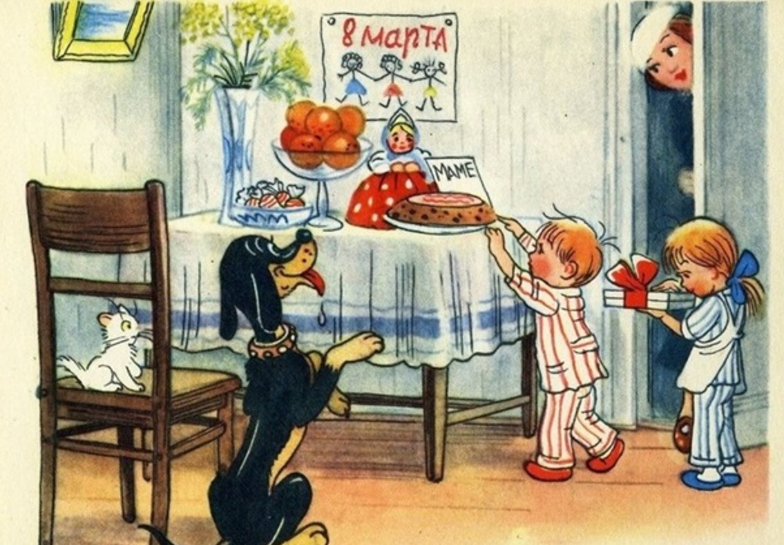 День 8 березня ставав головним болем для радянських чоловіків, яким доводилося вітати не тільки близьких родичок, але й співробітниць. Якщо вони хотіли подарувати комусь щось краще за убогу мімозу, то за вартісним подарунком (наприклад, парфумерією) доводилося неабияк побігати. Натомість жінки бодай у цей день могли претендувати бодай на перепочинок від хатніх обов’язків.