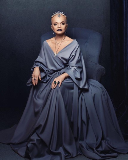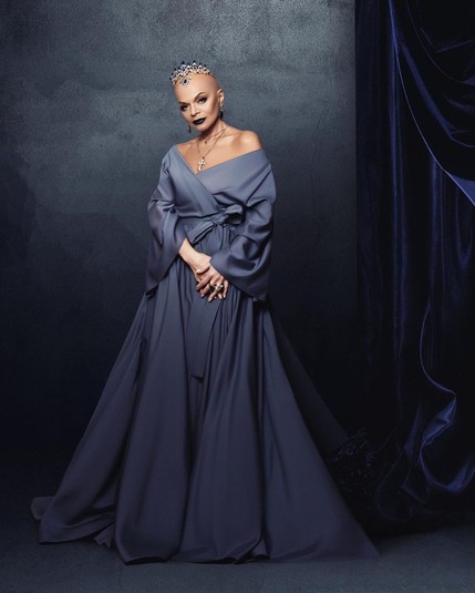 В Інстаграмі 66-річна виконавиця опублікувала низку знімків, на яких позує абсолютно лисою з короною на голові. Також на фото Доліна постає у довгій сукні із чорною помадою на губах.