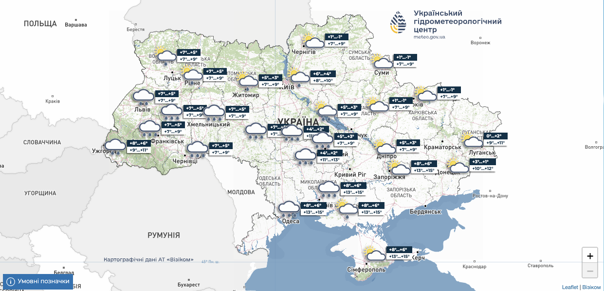 - у Києві: Температура вночі +1°..+3°, вдень +7°..+9°. Хмарно, невеликий дощ.