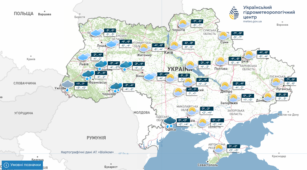 - у Києві: Температура вночі -9°..-11°, вдень -5°..-6°. Хмарно.