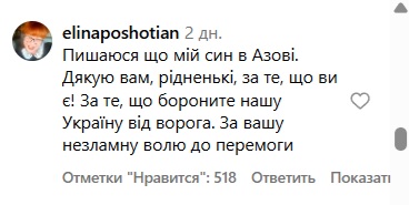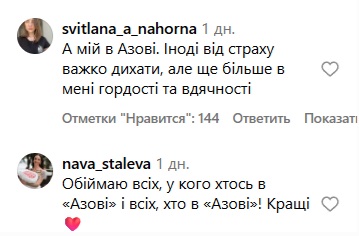 Ролики також прокоментували жінки, у яких близькі зараз в «Азові». «А мій в Азові. Іноді від страху важко дихати, але ще більше в мені гордості та вдячності», «Я, як мати Азовця, знаю, як це – чекати, як це – хвилюватись і як пишатись своїм сином, знаю він по-іншому не міг», «Пишаюся, що мій син в Азові. Дякую вам, рідненькі, за те, що ви є! За те, що бороните нашу Україну від ворога. За вашу незламну волю до перемоги», – написали жінки.