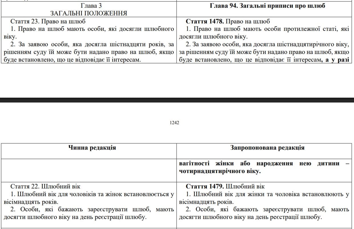 У новому законопроєкті Ради йдеться про те, влада розглядає можливість надання права на шлюб особі 14 років, у разі вагітності або народження нею дитини. Така примітка зазначена, як стаття 1478.