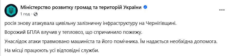 «Росія знову атакувала цивільну залізничну інфраструктуру на Чернігівщині», – зазначили у відомстві. За наявною інформацією, російський безпілотник влучив у тепловоз. Унаслідок удару виникло задимлення та пожежа.