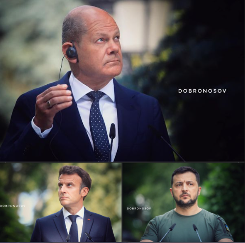 На фото видно, що і Макрон і Шольц здивовані та насторожені несподіваним звуком. Обоє лідерів намагалися знайти в небі джерело звуку.