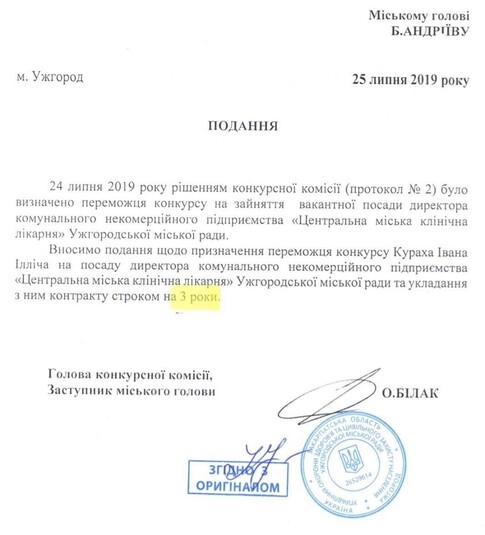 «Після розгляду кандидатур на вакантну посаду керівника лікарні конкурсна комісія, яку очолював Олександр Білак, ухвалила рішення та обрала переможця конкурсу Івана Кураха. Наступний крок – подання на ім'я міського голови Богдана Андрєєва про призначення терміном на 3 роки Івана Кураха на посаду директора КНП «Ужгород міська лікарня». Це подання із зазначеним терміном дії договору з переможцем конкурсу «3 роки» було опубліковано на сайті Ужгородської міської ради», – пояснили журналісти, додавши, що подальший розвиток подій викликає багато питань.