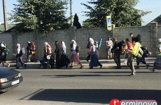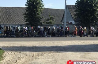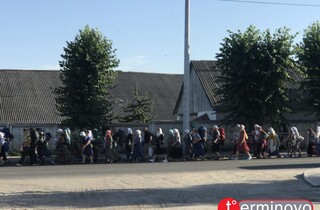 У колоні видно здорових молодих чоловіків, жінок із маленькими дітьми, яких везуть у колясках у 30-градусну спеку, закутаними у хустки, та старців, а також священників Московського патріархату.
