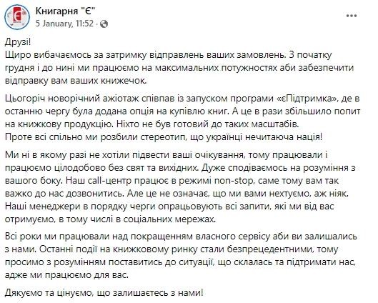 «Ми ні в якому разі не хотіли підвести ваші очікування, тому працювали та працюємо цілодобово без свят і вихідних. Дуже сподіваємося на розуміння з Вашого боку. Наш call-центр працює в режимі non-stop, саме тому вам так важко до нас додзвонитися», – повідомили на сторінці «Книгарні «Є» у Facebook.