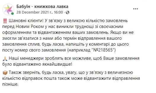 Збій у роботі книгарень відбувся з кількох причин. Українці почали масово використовувати «ковідну тисячу» на оплату книг і за часом це збіглося з новорічними святами, коли ажіотаж набагато більший. Крім того, перед святами компанії почали масові розпродажі та акції, а це потік замовлень тільки посилило.