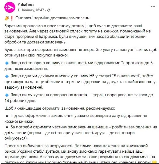На сторінках українських книгарень з'явилися повідомлення з вибаченнями та новими термінами відправки книг. У «Є» терміни збільшилися до двох тижнів. І всім клієнтам приносять вибачення за затримки та посилаються на те, що робота йде на максимальних потужностях.