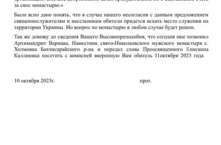 «Саме тому я вважаю що ця заборона (йдеться про заборону проводити священнослужіння аріхмандриту Гавриїлу – «Главком») – меседж всьому «крилу» проукраїнськи налаштованого духовенства УПЦ МП, що їхні думки, по-перше, нікому не цікаві, по-друге, є такими які суперечать політиці добровільного замовчування та особистим переконанням керівництва церкви. Неодноразово мною, як намісником монастиря доповідалась ситуація щодо справ в обителі, тиску окупаційної влади, спеціальних служб і т.д. Як я вже розповідав, відповіді або не було зовсім, або «…действуйте по ситуации…», – написав архімандрит.