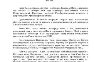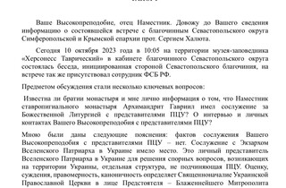 Як зазначив священник, який втік з окупованого Криму, 10 жовтня 2023 року клірика монастиря у Севастополі викликав протоієрей (РПЦ) Сергій Халюта в благочиння Севастопольського округу. «Під час бесіди протоієреєм Сергієм та представником ФСБ було озвучено «цікаві» тези стосовно нашого монастиря, його переходу в РПЦ та розв'язання цього питання з керівництвом нашої церкви (УПЦ)», – написав архімандрит Гавриїл. Він також додав, що монастир відвідала незрозумілого складу «комісія» на чолі з єпископом Бахчисарайським Калініком (Чернишевим), яка мала на меті перевірити стан справ в монастирі (який їм не підпорядковується) та поспілкуватися з насельниками.
