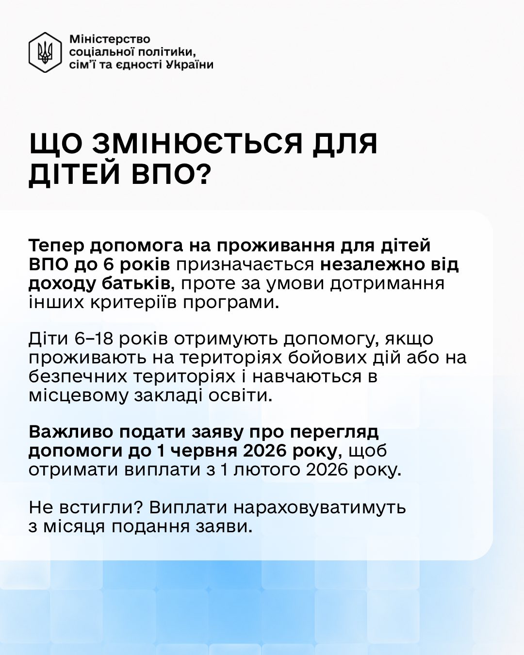 Згідно з оновленими правилами, термін виплат для підтримки найбільш вразливих категорій переселенців збільшено з 24 до 30 місяців. Основні зміни торкнулися дітей: тепер допомога на проживання для малечі до 6 років призначається незалежно від рівня доходу родини (за умови дотримання інших критеріїв програми).