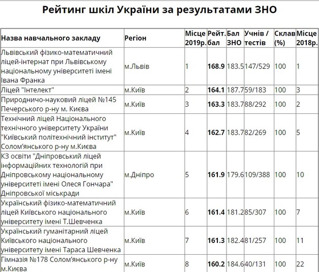 Про це йдеться на порталі Освіта.ua, що склала рейтинг загальноосвітніх шкіл України за підсумками ЗНО 2019 року.