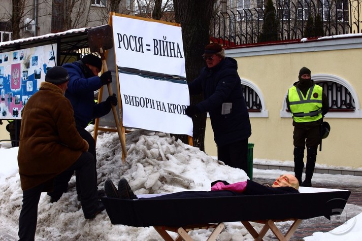 Противники виборів президента РФ на території України принесли до будівлі консульства труну з опудалом в масці Володимира Путіна. Його встановили біля входу в консульство поруч з плакатом «Росія = війна. Вибори на крові».