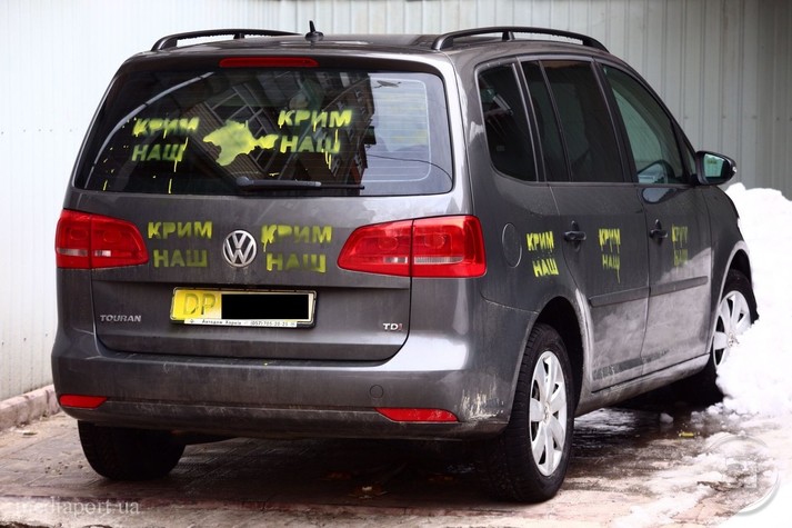 Невідомі залишили написи на задньому склі і з боків автомобіля Volkswagen з дипломатичними номерами РФ.