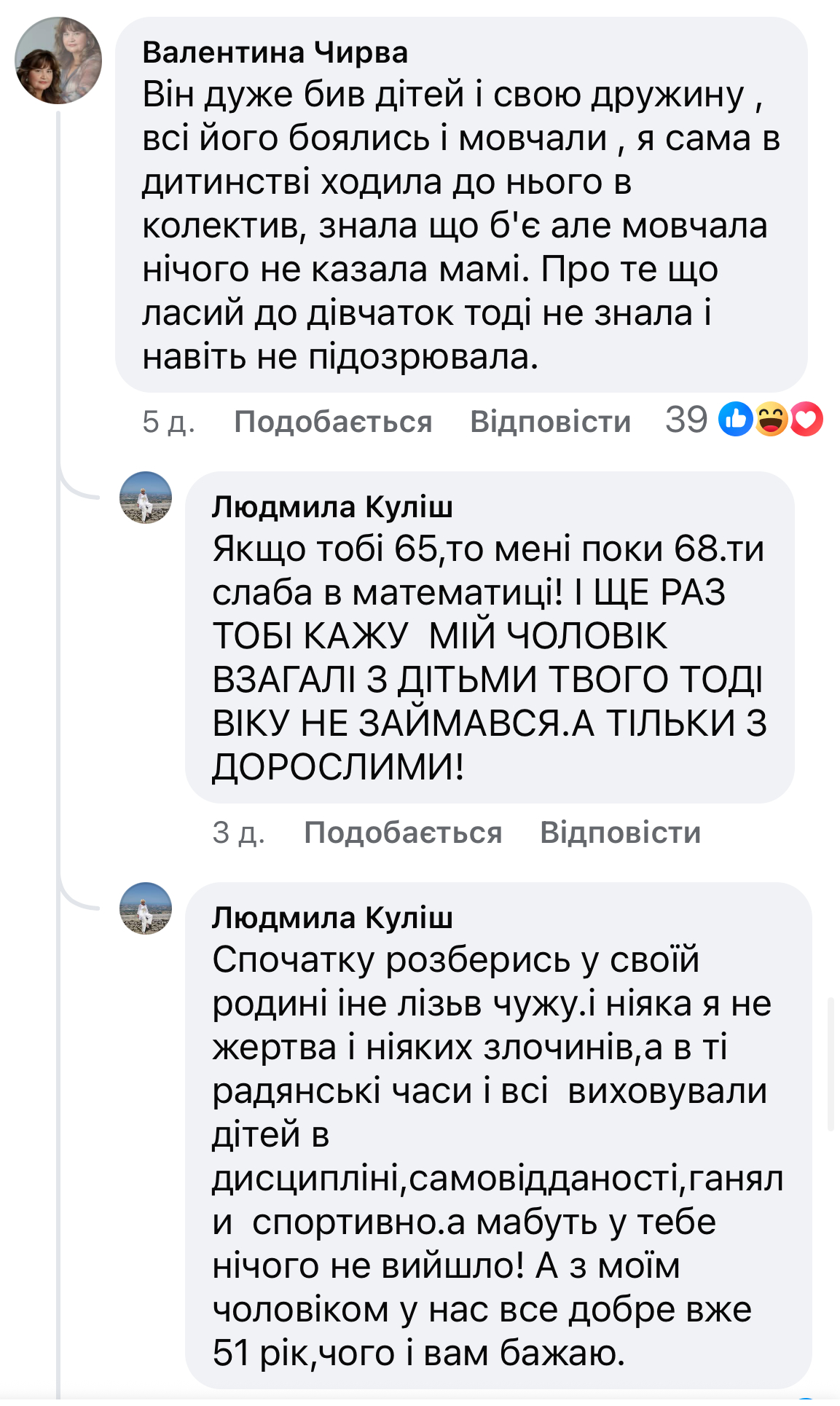 «Він ніколи не займався з дітьми, а тільки з дорослими (...) І взагалі, за довгі роки праці більше 1000 учнів було і є в колективі. І якщо серед такої кількості є невдоволених хоч 100, то це нормально: немає ідеальних колективів і ідеальних тренерів!» – написала жінка. Проте, як стверджують учениці школи, до старшої групи школи потрапляли також дівчата 10-11 років.