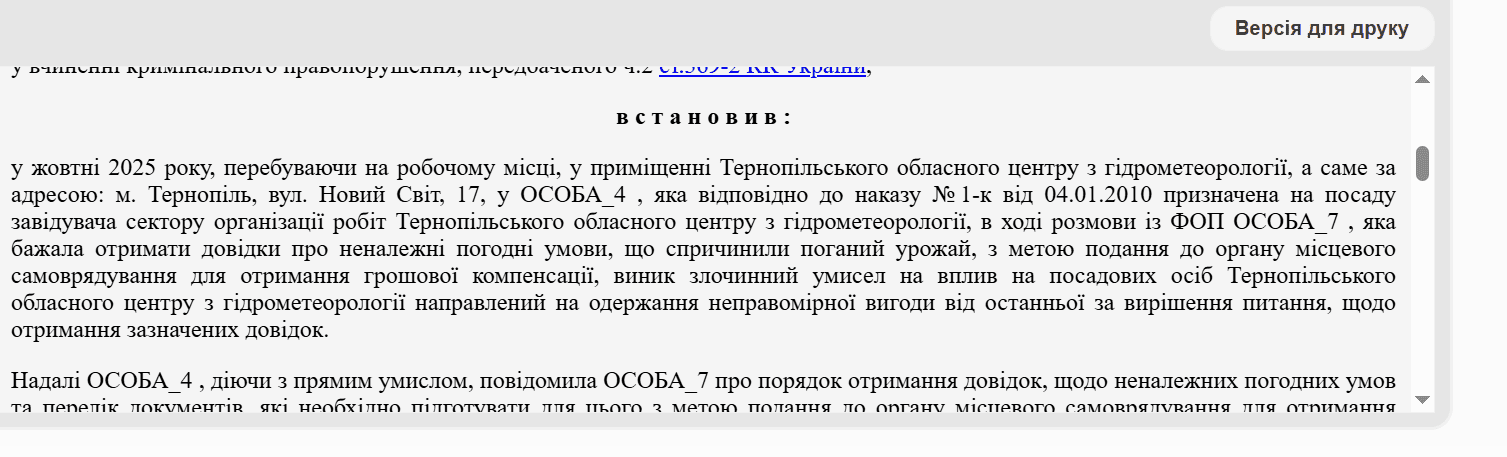 Як ідеться у вироку Тернопільського міськрайонного суду, у жовтні 2025 року до посадовиці гідрометцентру звернулася підприємиця, якій були потрібні офіційні підтвердження про неналежні погодні умови. Такі документи дозволяли ФОП претендувати на компенсацію від органів місцевого самоврядування за втрачений врожай.