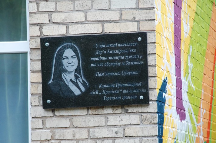 У Торецьку Донецької області відкрили меморіальну дошку Дар'ї Каземіровій, яка у 2018 році загинула від обстрілу проросійських бойовиків.