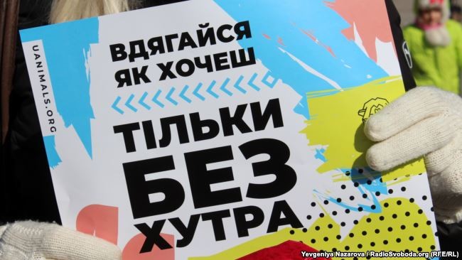 Мітингувальники принесли з собою плакати з написами «Вдягайся як хочеш – тільки без хутра», «Ваша примха – їхня смерть», «Друг не шуба» та інші, а також скандували «Україна – гуманна країна», «Краще голим, ніж у шубі».
