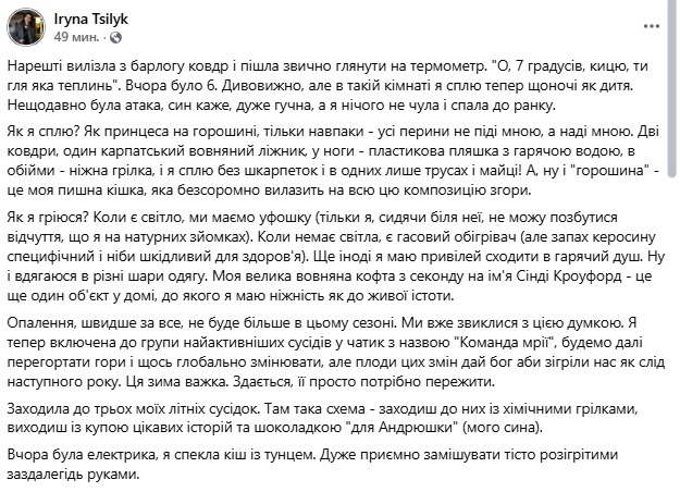 Українська письменниця пише, що в її квартирі дуже холодно, температура повітря в ній не перевищує 10 градусів. Вона змушена вдягатися тепло, вкриватися кількома ковдрами відразу.