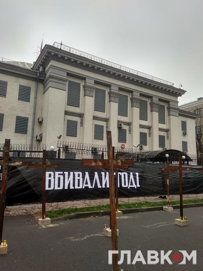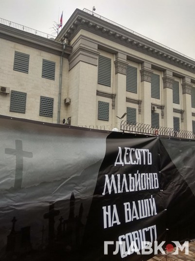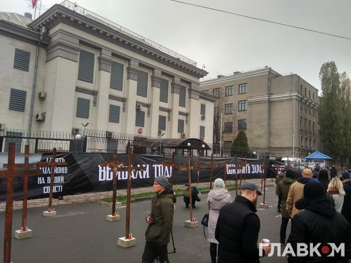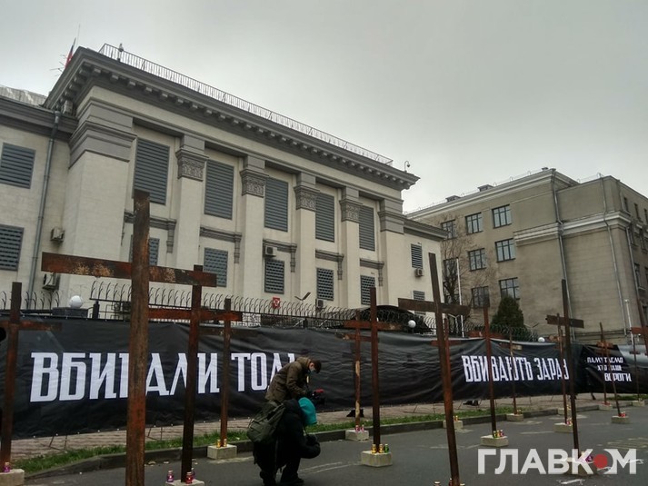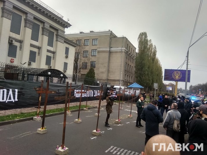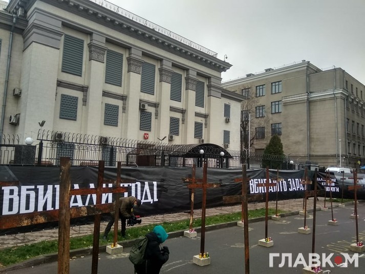 Активісти «Нацкорпусу» поставили на парковці перед посольством символічні металеві хрести, а також розтяжку з написами: ««Пам’ятаємо, хто наші вороги», «Вбивали тоді. Вбивають зараз».