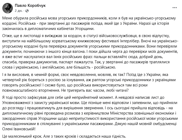 Український письменник і військовослужбовець Павло Коробчук повідомив про використання російської мови угорськими прикордонниками під час перевірки документів у поїзді на українсько-угорському кордоні. Про це повідомляє «Главком».