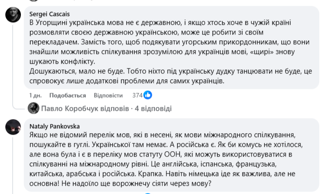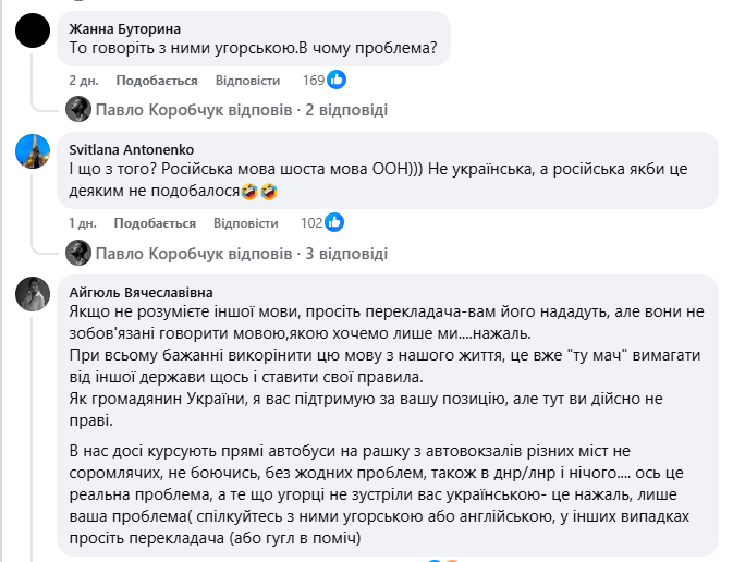 У коментарях під дописом розгорнулася дискусія щодо доречності використання російської мови угорськими прикордонниками та очікувань українців за кордоном.