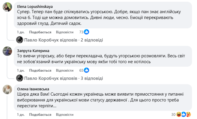 Водночас частина користувачів підтримує позицію автора допису та наголошує на важливості відстоювання статусу української мови навіть у подібних ситуаціях.