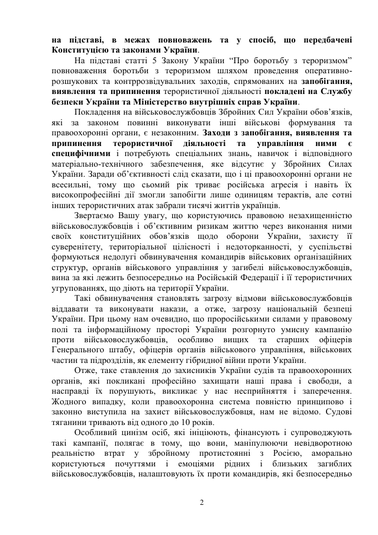 Вони наголосили на цинізмі осіб, які «ініціюють, фінансують і супроводжують такі кампанії, полягає в тому, що вони, маніпулюючи невідворотною реальністю втрат у збройному протистоянні з Росією, аморально користуються почуттями і емоціями рідних і близьких загиблих військовослужбовців, налаштовують їх проти командирів, які безпосередньо виконують свій службовий обов’язок і з не менш глибокою скорботою переживають втрату своїх бойових побратимів».