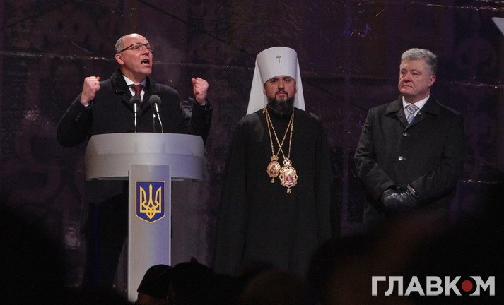 Голова Верховної Ради Андрій Парубій, Митрополит Київський і всієї України Епіфаній та Президент України Петро Порошенко
