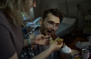 «В нього майже не було обличчя, однак зараз, завдяки титанічній роботі лікарів, це майже не помітно. Хлопець зустрічає нас в гарному настрої, жартує та посміхається. Аліна допомагає йому поїсти, зустрічає фізіотерапевта, а після процедури – просто лягає поряд. І те, як вони лежать вдвох – говорить більше будь-яких слів. Цікаво, що Андрій постійно аналізує, що він зробив не так. Якби він виїхав з позиції раніше, чи навпаки затримався. Але ніколи не думає про те, що міг би не йти на війну. Для нього такого варіанта не існує», – зазначили фотографи.