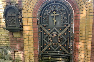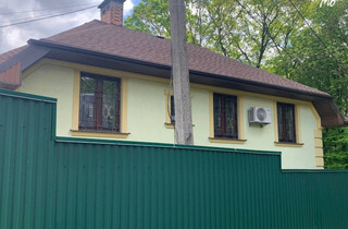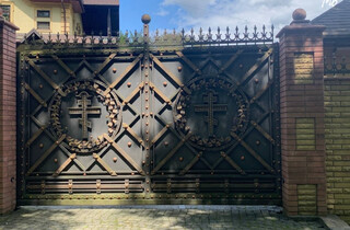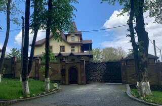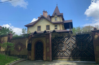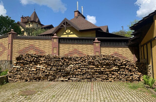 Будинок прихований високою огорожею – 2,5-3 метра. Головні ворота та хвіртка прикрашені кованими хрестами й кованими елементами декору. Трішки нижче головного входу лежать складені дрова, праворуч огороджене каменем місце для паркування.