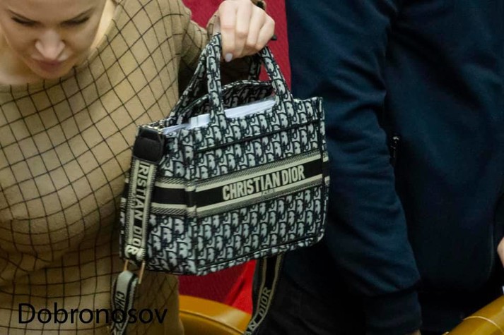 Ще одна «слуга» Mаргаріта Шол прийшла в Раду з Dior Book Tote mini. Ця впізнавана модель із суцільною вишивкою Dior Oblique синього кольору. Її можна купити за 3200 cad (to usd – $ 2532) або 67 653 грн.