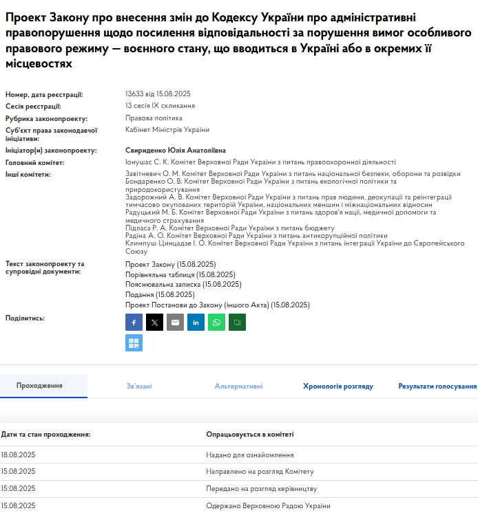 Зазначається, що ініціатором проєкту є прем'єр–міністр України Юлія Свириденко. Головним визначено комітет Верховної Ради України з питань правоохоронної діяльності, куди документ надійшов на опрацювання 18 серпня.