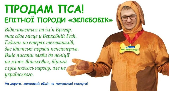 Після того, як став відомим озвучений одіозним нардепом з фракції «Слуга народу» Євгеном Брагарем заклик до пенсіонерки з-під Кропивницького продати свого пса, аби мати змогу сплатити за газ для обігріву і приготування їжі, українські користувачі інтернету почали масово створювати фотожаби на цю тему.