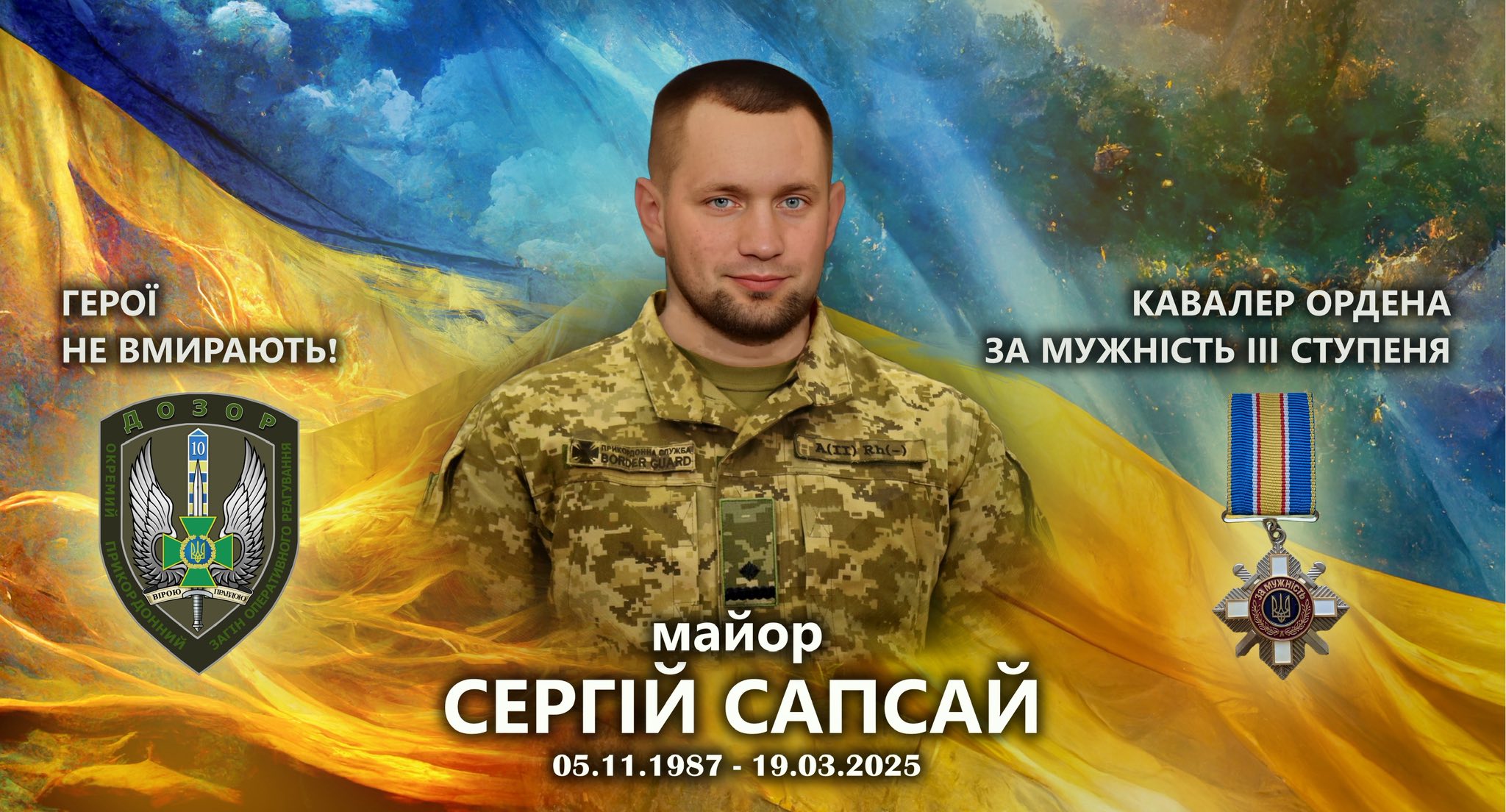 19 березня 2026 року загинув один з найкращих і найпідготовленіших офіцерів 10 мобільного прикордонного загону «Дозор» – майор Сергій Сапсай, заступник начальника відділення ударно-розвідувальних безпілотних авіаційних систем – начальник 1 мобільної групи. Це сталося вночі, коли екіпаж розвідки повертався зі своєї позиції неподалік кордону на Сумщині. Броньований «Форд Рейнджер» потрапив під удар ворожого БпЛА. У результаті троє поранених, а Сергій Сапсай загинув. Про це повідомляє «Главком» із посиланням на Державну прикордонну службу України.