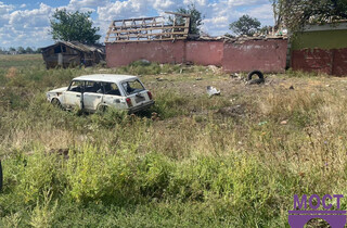 Багато будинків зруйновано та пошкоджено, а на узбіччях і прямо на дорогах стоять розбиті машини та невелика сільгосптехніка.