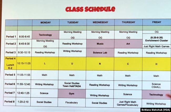 Як починається та як закінчується навчальний день у школі, скільки часу триває обід, скільки уроків на день, та які перерви між уроками. Про це батьки нью-йоркських школярів дізнаються під час дня відкритих дверей.