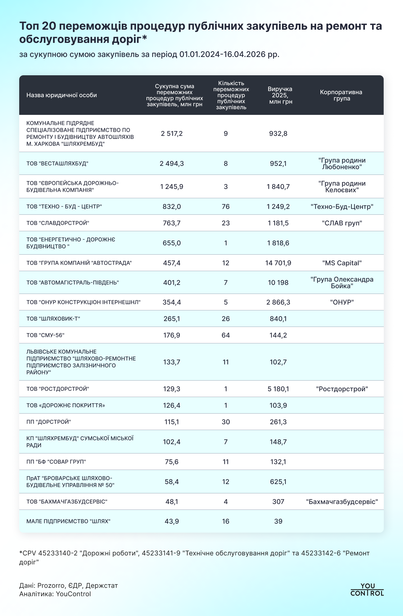 Близько 85% (11 млрд грн) усіх проаналізованих закупівель за період з 01.01.2024 року до 16.04.2026 року припадає на 20 компаній-переможців. Найбільші суми держзамовлень за проаналізованими CPV, по 2,5 млрд грн кожна, отримали Комунальне підрядне спеціалізоване підприємство по ремонту і будівництву автошляхів м. Харкова «Шляхрембуд» та ТОВ «Весташляхбуд».