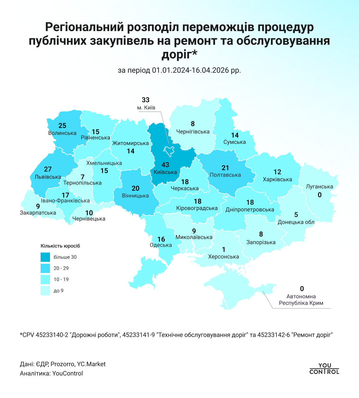 Місцем реєстрації найбільшої кількості компаній з вибірки стали Київ (33) та Київщина (43). Також значна кількість юросіб з виконання ремонтних дорожніх робіт зафіксована у Львівській (27), Волинській (25), Полтавській (21) та Вінницькій (20) областях.