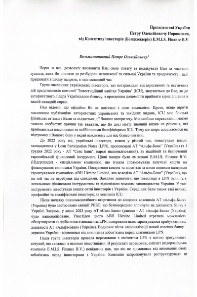 Як зазначається у листі, інвестори вкладали кошти в цінні папери компанії E.M.I.S. Finance B.V., які у попередні роки продавалися та обслуговувались через низку фінансових установ, у тому числі «Сенс Банк». Однак, після введення санкцій проти колишніх власників банку, обслуговування цих паперів було припинено. Разом з тим нідерландська компанія E.M.I.S. Finance B.V. запропонувала реструктуризацію зобов’язань, на яку погодилася більшість власників цінних паперів - LPN. На жаль, компанія ICU, яка володіє контрольним пакетом у двох із десяти серій LPN, виступила проти цієї реструктуризації. Це, на думку інвесторів, заблокувало справедливий вихід із ситуації для сотень невеликих українських інвесторів. Вони вважають, що ICU сповідує стратегію так званого «vulture fund» – фонду, який скуповує борги зі знижкою і чекає на відновлення емітента для отримання максимального прибутку.