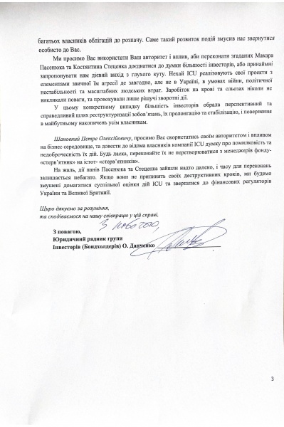 «Шановний Петре Олексійовичу, просимо Вас скористатись своїм авторитетом і впливом на бізнес середовище, та довести до відома власників компанії ICU думку про помилковість та недоброчесність їх дій», – йдеться у листі.