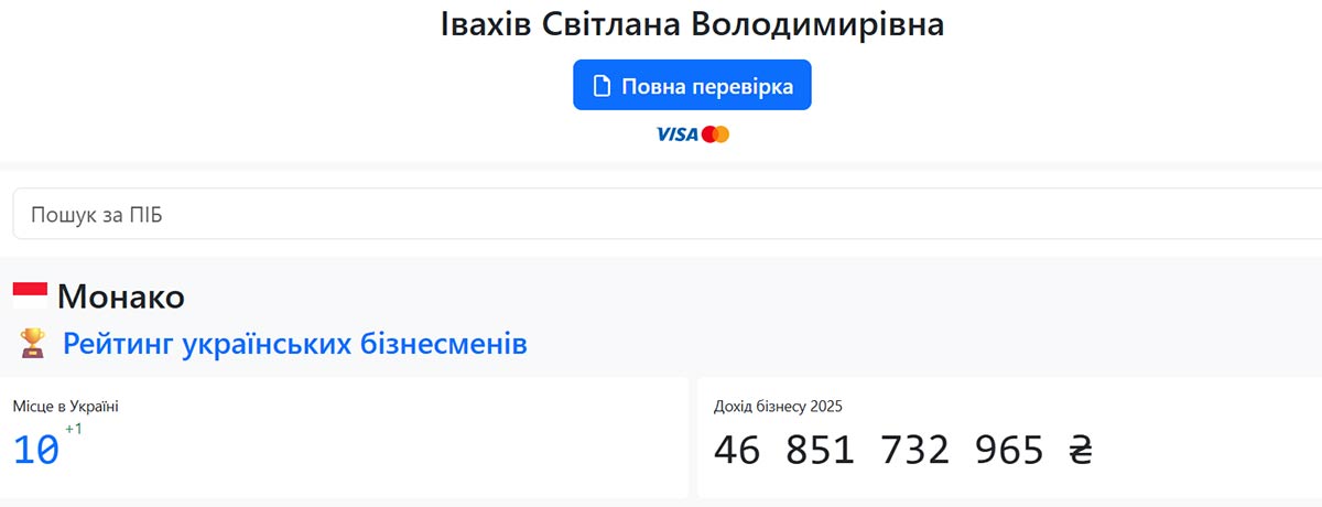 У ТОП-10 найбагатших українців, за версією ресурсу Опендатабот, потрапила підприємниця Світлана Івахів з доходом 46,9 млрд грн. Вона – єдина жінка, яка опинилася у першій десятці мільярдерів поруч із Олексієм Порошенком (сином п'ятого президента Петра Порошенка), Дмитром Фірташем та Андрієм Губським.